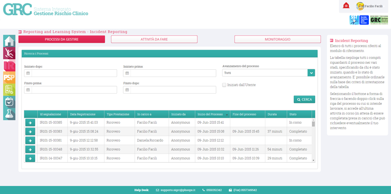 Ad esempio, nella segnalazione degli eventi avversi, il processo è costituito dalla gestione di tutto il processo di segnalazione e gestione dell'evento (a partire dalla segnalazione, alla sua analisi preliminare, alla valutazione del suo esito, la realizzazione di M&M o audit grc fino alla valutazione e validazione dell’analisi di approfondimento dell’evento), la quale prevede l’intervento di diverse figure professionali: segnalatore, facilitatore, crm e staff.